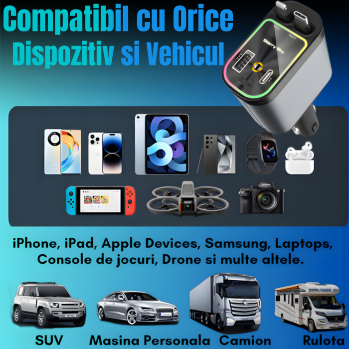 Da, incarcatorul include cabluri pentru majoritatea dispozitivelor: Lightning pentru Apple si Type-C pentru Android si alte dispozitive moderne. Are si porturi USB-A si USB-C pentru alte cabluri.
